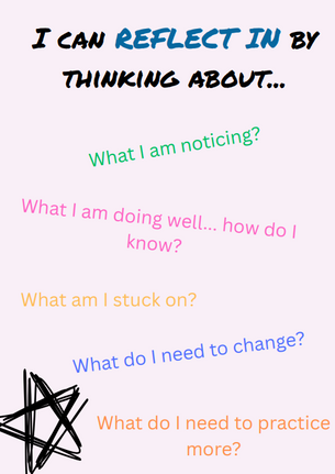 The team created posters and prompts to support students (and teachers) to ask questions to support reflection IN and ON learning. Christine described that, "Initially students were getting up and referring to it, but not so much now. Now it's more of an anchor chart for me - a visual reminder to intentionally use this learning strategy across the day."